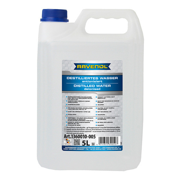 RAVENOL Destilliertes Wasser (entionisiert) - հատուկ պատրաստված թորած, դեիոնացված ջուր: Չի պարունակում իոններ: Համապատասխանում է VDE ցուցումներին: Իդեալական է բոլոր տեսակի ռուսական և Ներմուծված մարտկոցների համար: Կարող է օգտագործվել առօրյա կյանքում գոլորշու արդուկների, ակվարիումների և այլնի համար: